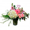 Precioso y delicado jarrón de flores en tonos blancos y rosas, que incluye una exquisita selección de rosas spray, gerberas y hortensias, todo complementado con una variedad de verdes frescos. Esta dulce y romántica composición es perfecta para sorprender y encantar a quien la reciba, aportando un toque de elegancia y calidez a cualquier ocasión. Ideal para expresar sentimientos especiales, este jarrón transformará cualquier espacio en un refugio de belleza y ternura.