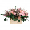 Caja de madera decorativa compuesta por diferentes verdes y flores secas y preservadas en diferentes tonos rosa. Un detalle que perdurara en el tiempo.