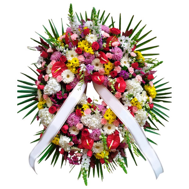 Corona con mezcla de diferentes tipos de flores y de colores, utilizando flores tales como margaritas, rosas, claveles, gerberas, etc. Una composicion idonea para dar adios a ese ser querido. Puede llevar cinta con dedicatoria, lo entregamos a cualquier tanatorio de Madrid. Diametro aproximado 90cm.