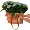 Original bolso de esparto con hilos decorativos, que contiene dos hortensias Magic en color azul. Un regalo diferente que combina naturaleza y estilo en una sola propuesta.